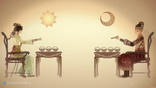 Ответ на загадку прост: установите солнце над женщиной с тремя тарелками, а луну — над мужчиной с четырьмя.