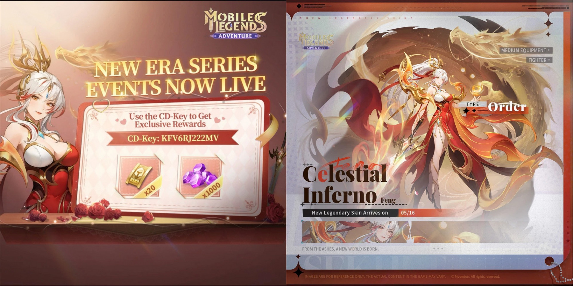 Каждый год для серии событий «Новая эра» разработчиками создаётся новый коллекционный облик. В этом году вышел легендарный скин Celestial Inferno из серии Dragonfire Saga на пятизвёздочного героя Фэн. Вместе с ним вы получите эксклюзивную эмоцию, свитки призыва и многие другие полезные награды.