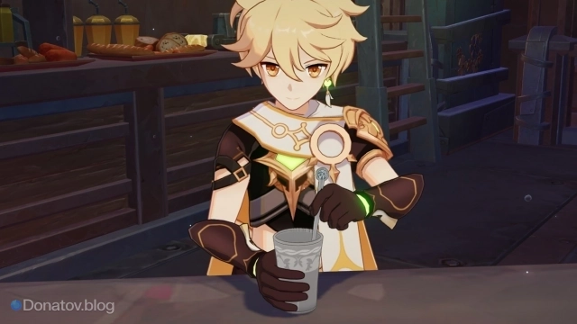 Перед вами откроется меню приготовления напитков. Паймон (верхний левый угол) будет принимать заказ и подсказывать вам, какой коктейль нужно приготовить