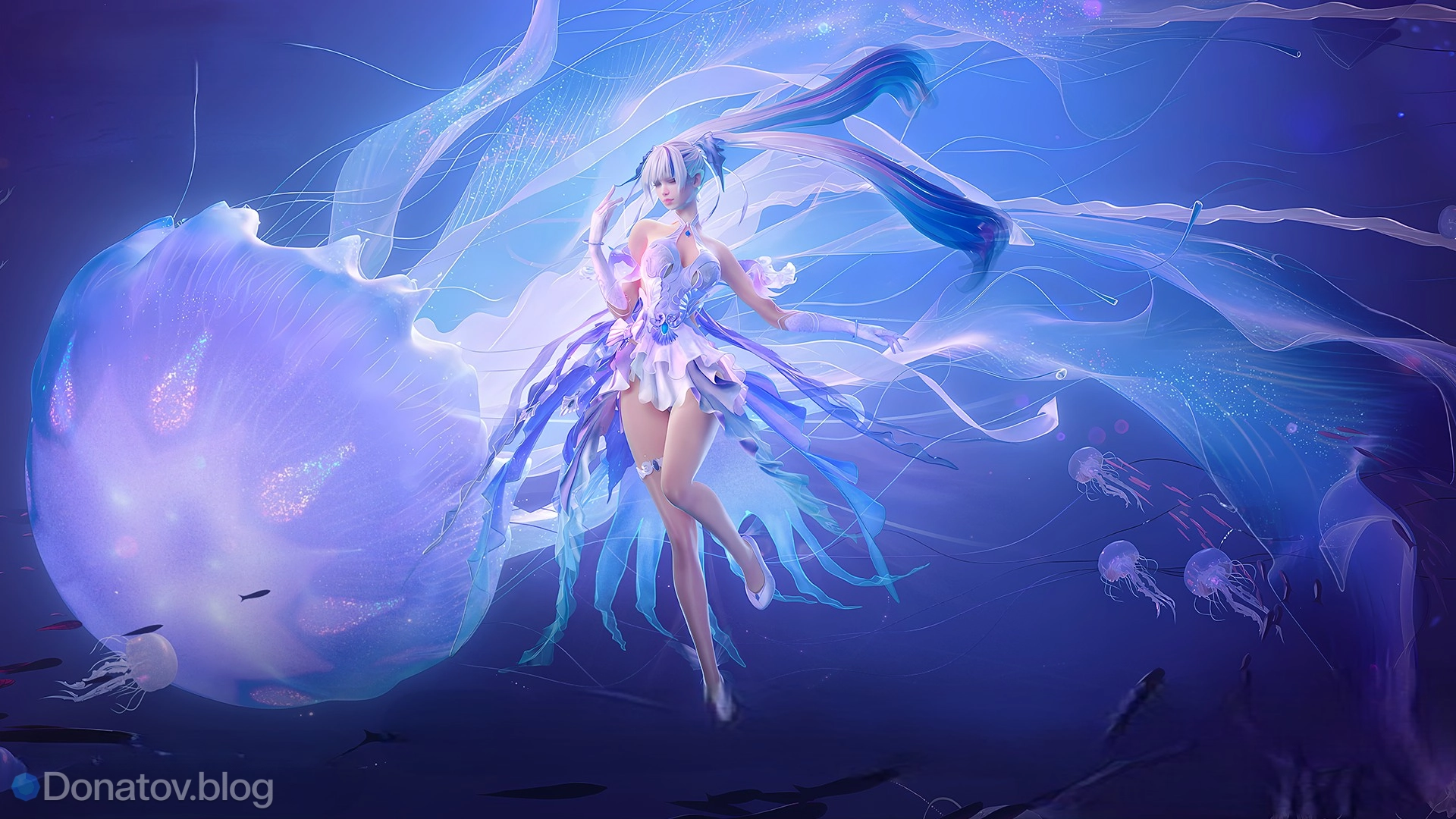 - Уровень 1. Базовый облик. Наряд выглядит как изящное платье или легкая броня в бело-голубых тонах. На этом этапе магия и свечение сведены к минимуму, но в основе лежит силуэт, напоминающий подводного обитателя.