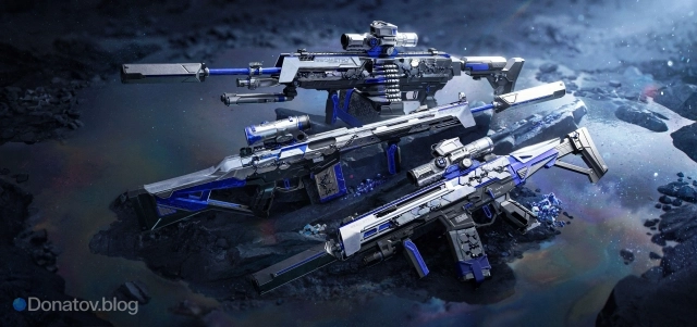 В качестве декора по корпусу проходят строгие линии, напоминающие трещины в кристалле или цифровые разломы. Пулемёт выглядит как оружие с космической базы будущего — строгая геометрия и сдержанный блеск подчёркивают общую стилистику набора.