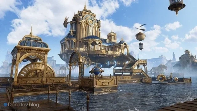 - Стимпанк-снаряжение, облики и окружение. Новые костюмы, оружейные скины, сеты для персонажей — всё в стиле стимпанка. Дирижабли, фабрики, башни — всё окружение оформлено в единой эстетике. Кстати, все новые скины обновления 3.8 можно увидеть здесь.