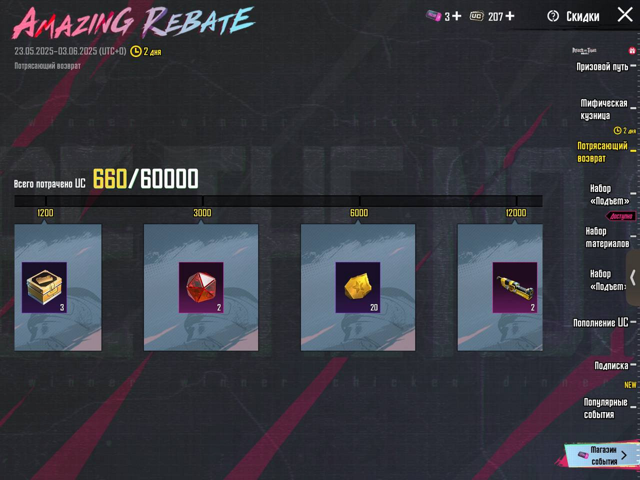 Будучи участником события, ты можешь двигаться по шкале прогресса постепенно, забирая каждую награду по отдельности (по мере выполнения условий её получения), или же достичь отметки в 60000 UC и получить все награды за ивент разом.