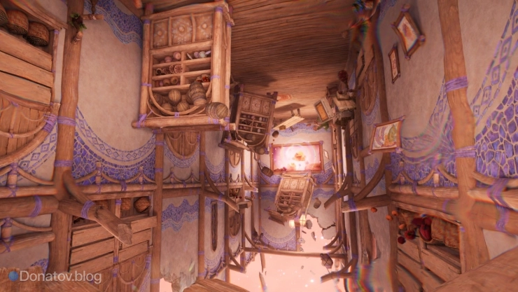 Активируйте абилку полёта и зацепитесь за следующий передвижной стол. Разверните камеру на сто восемьдесят градусов и спланируйте на отступ с книжными полками — там спрятались ещё две Росы Вдохновения.