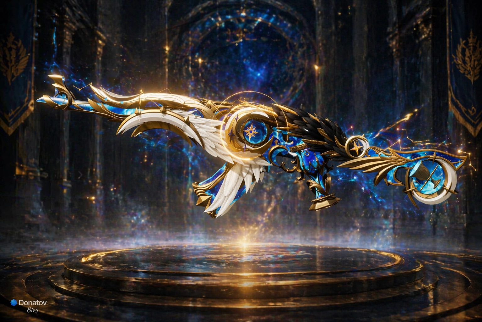 Роскошный AKM «Храм света и тьмы» (Golden Feather) — это величественный облик, который выглядит как древний артефакт. Дизайн этой пушки построен на контрасте: одна часть корпуса украшена светлыми ангельскими крыльями, а другая — тёмным оперением и магическими сферами, напоминающими ночное небо.