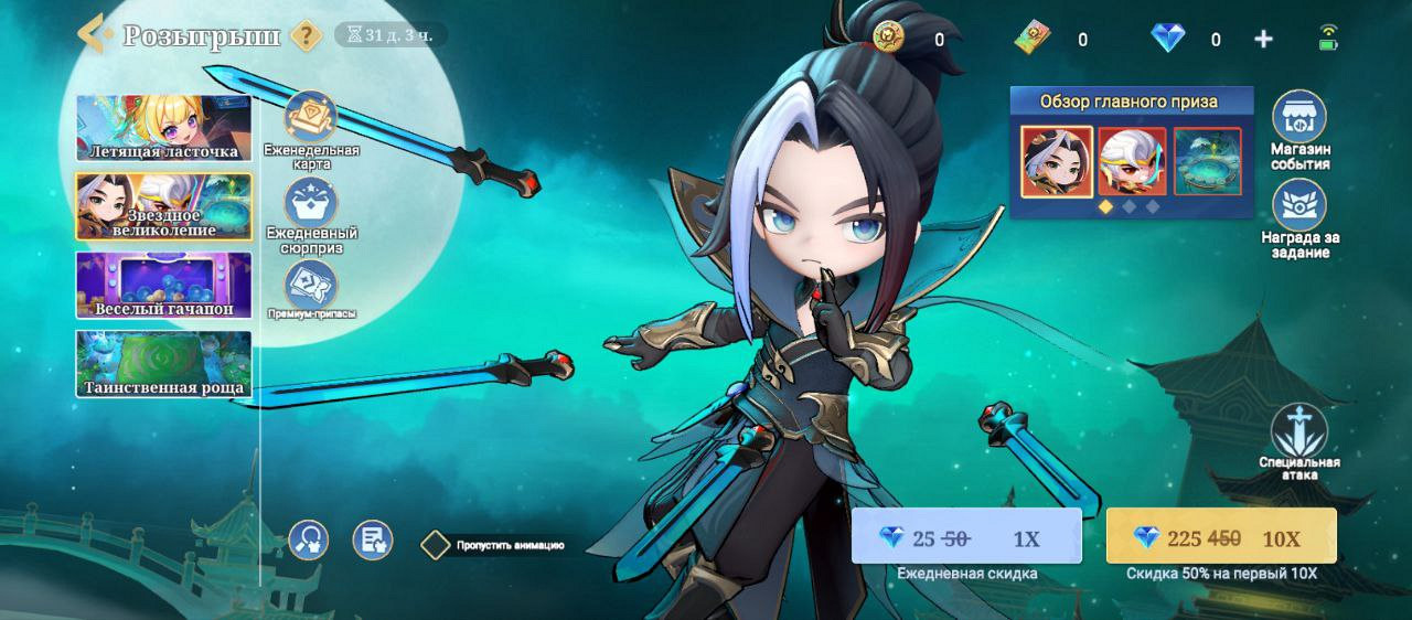 Сейчас в разделе с розыгрышами четыре события: «Летящая ласточка», «Весёлый гачапон», «Таинственная роща» и «Звёздное великолепие». Посмотрим на последний поближе.